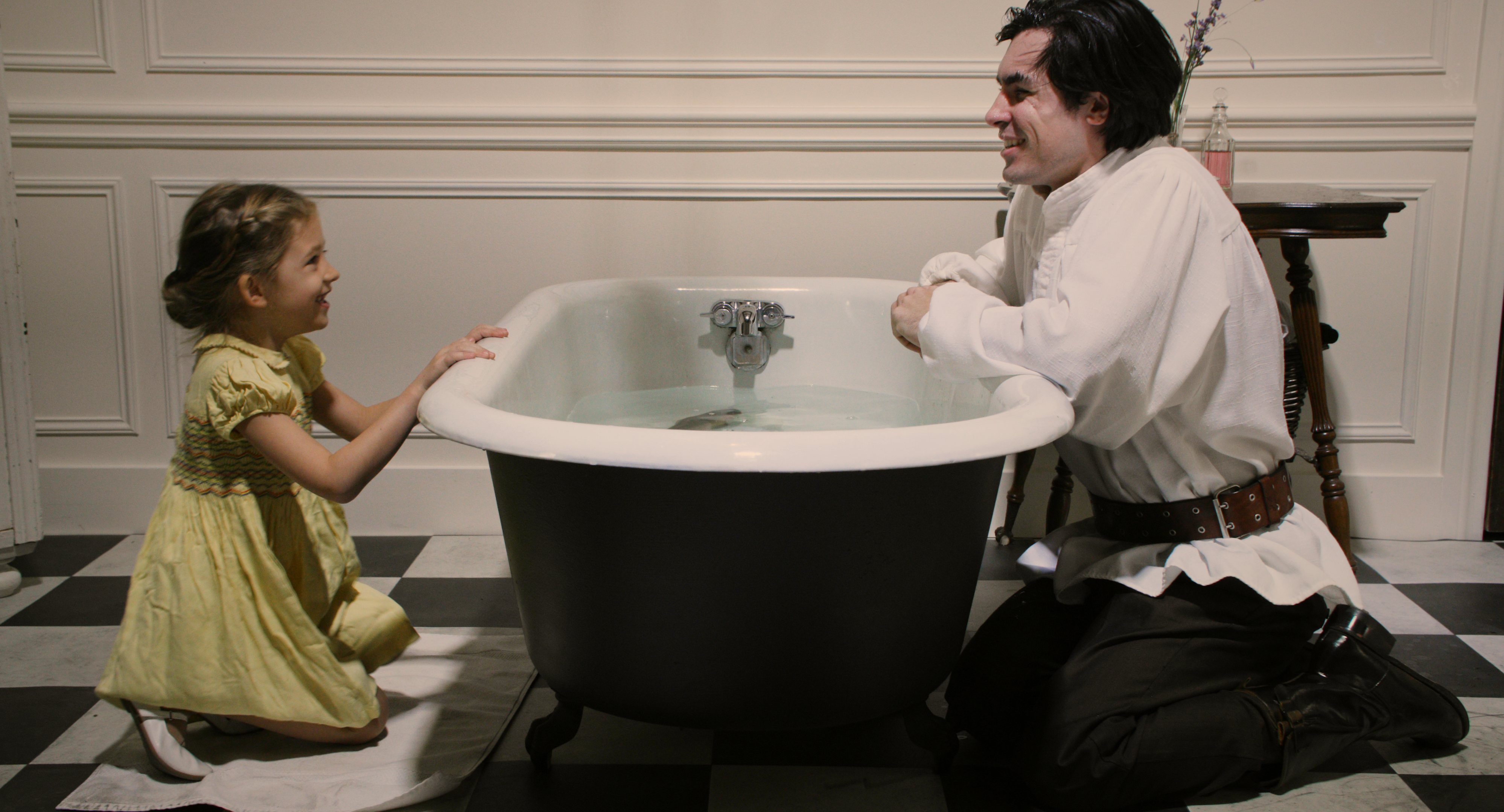 Movie still: Young Kati (Franky Glover) and her father, Eliezer (Chase Lawless), watching fish swim in their bathtub.
